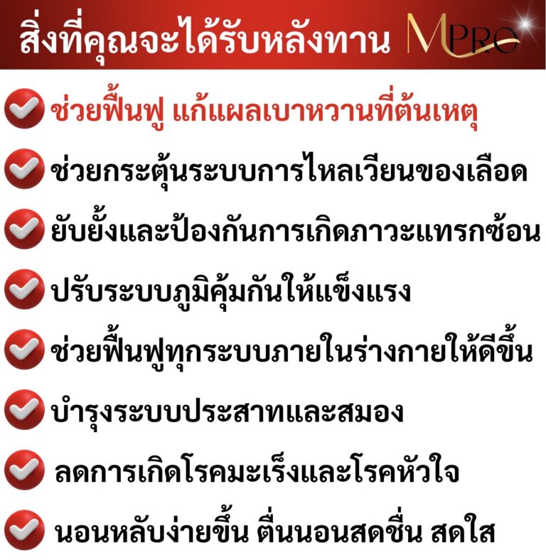 แต่พี่โชคดีที่เพื่อนของลูกชายแนะนำให้ทานสมุนไพรสกัดจากธรรมชาติที่ชื่อ MPro เพราะคุณแม่เขาก็มีอาการเหมือนพี่ แถมหนักกว่าพี่อีก ตอนเป็นถึงขั้นหัวใจเต้นผิดจังหวะ และต้องไปกายภาพบำบัดด้วยเครื่องสัปดาห์ละ 2-3 ครั้ง รักษากับหมอดังๆมาเยอะมาก แต่ก็ไม่หาย เขายังทานแล้วหายเป็นปกติ พี่เลยสั่งชุดโปร 2 แถม 1 มาลองทาน