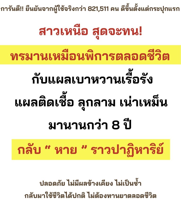 สวัสดีคะ ชื่อ สาว น่ะคะ อายุ 48 ปี เป็นคนแพร่คะ วันนี้พี่อยากจะมาแชร์ประสบการณ์ของตัวเอง เล่าย้อนกลับไปเมื่อ 8 ปีที่แล้วคะ พี่เคยป่วยเป็นแผลเบาหวานเรื้อรัง แต่ตอนนี้หายเป็นปกติแล้ว พี่มีอาการ แผลที่เท้า แผลอักเสบ แผลเริ่มลึก แผลติดเชื้อ จนมองเห็นเส้นเอ็นและกระดูก มีหนองไหล แผลลุกลามเป็นบริเวณกว้าง มีกลิ่นเน่าเหม็น ซื้อยามาทานก็ไม่ดีขึ้น
