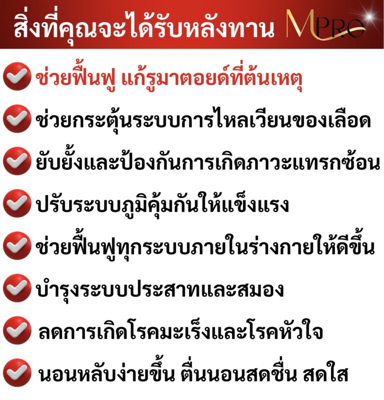 แต่พี่โชคดีที่เพื่อนของลูกชายแนะนำให้ทานสมุนไพรสกัดจากธรรมชาติที่ชื่อ MPro เพราะคุณแม่เขาก็มีอาการเหมือนพี่ แถมหนักกว่าพี่อีก ตอนเป็นถึงขั้นหัวใจเต้นผิดจังหวะ และต้องไปกายภาพบำบัดด้วยเครื่องสัปดาห์ละ 2-3 ครั้ง รักษากับหมอดังๆมาเยอะมาก แต่ก็ไม่หาย เขายังทานแล้วหายเป็นปกติ พี่เลยสั่งชุดโปร 2 แถม 1 มาลองทาน